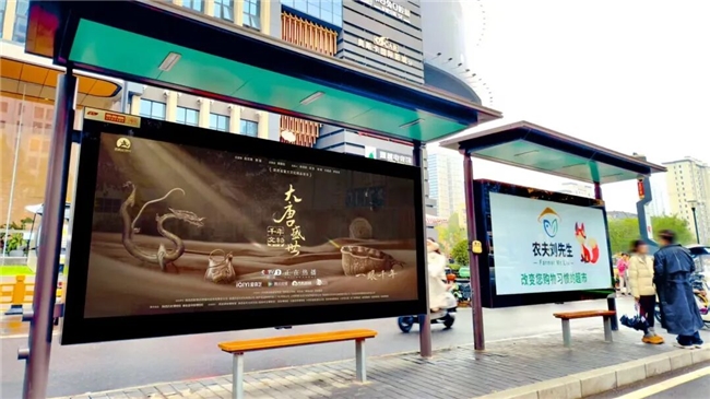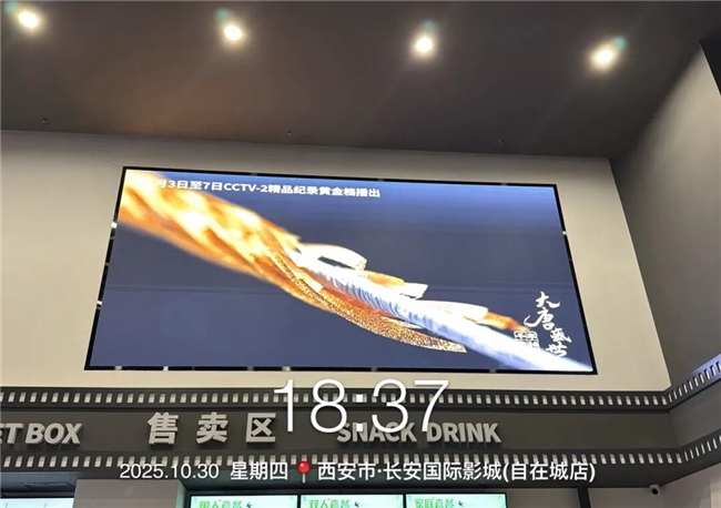 《千年文物・大唐盛世》以“纪录片+”为核心,在线下开展一系列丰富多彩的宣传推广及联动活动,覆盖商业空间、交通出行、数字生活、日常出行等多元场景,探索出纪录片与多元领域融合发展的新模式。在商业空间方面,西安王府井百货、广州北京路8K春天、广州白云之心等城市地标商圈的大屏联动展播每日循环播放预告片。核心商圈近千块影院大屏以宣传片、映前广告的形式同步播出预告,实现文化场景与商业空间的创新融合。
