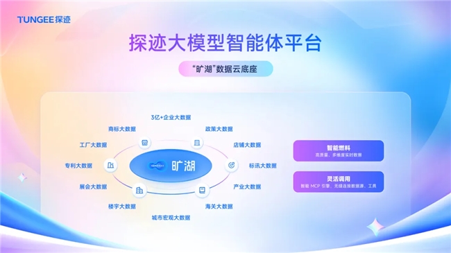 如果说“太擎”是AI数字员工的大脑与神经系统,那么“旷湖”数据云底座就是其运转的基础支撑。“旷湖”汇聚海量、多维度且经过深度治理的实时商业数据,为AI大模型提供高质量训练数据,从源头保障数字员工研判与推荐的精准性;通过智能MCP引擎将数据源封装成标准接口,支持Agent直接调用,同时提供灵活的DaaS订阅模式,让企业能按需使用数据资源,降低数据获取与应用门槛。