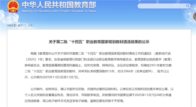 本次遴选根据《教育部办公厅关于组织开展第二批“十四五”职业教育国家规划教材遴选工作的通知》(教职成厅函[2025〕1号)要求,在各省级教育行政部门和全国行业职业教育教学指导委员会、教育部职业院校教学(教育)指导委员会、教育部直属高校推荐的基础上,经形式审查、网络评议、会议评议等程序评选出第二批“十四五”职业教育国家规划教材。