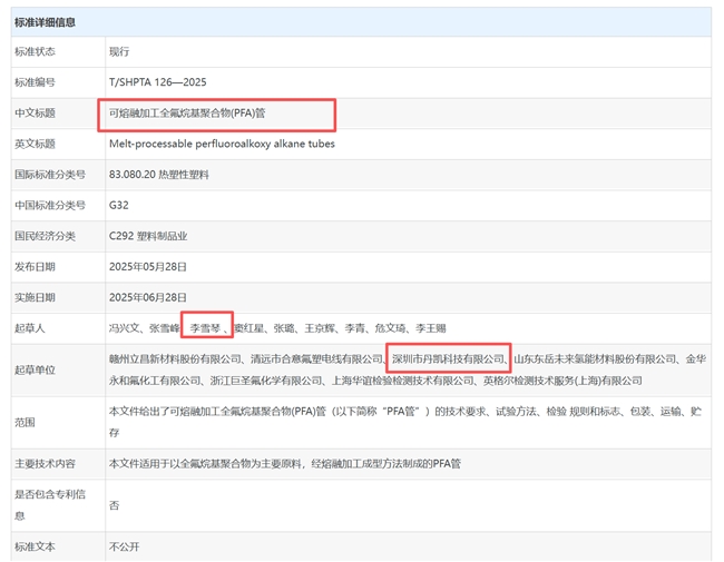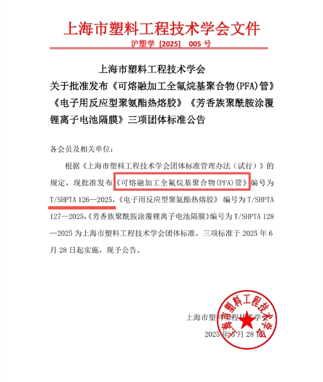 该标准编号:T/SHPTA 126—2025,中文标题 :可熔融加工全氟烷基聚合物(PFA)管,发布日期:2025年05月28日,实施日期:2025年06月28日。