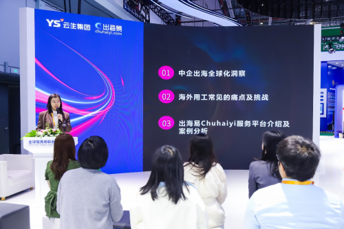 11月6日,云生集团海外业务总监汪鸿雁在进博会服务贸易馆展区带来两场《中企出海新浪潮下的全球人力资源数智服务实践》主题分享。汪鸿雁针对企业出海面临的政策壁垒、跨境合规、地缘风险等核心痛点,结合“出海易Chuhaiyi”在多个行业的典型服务案例,详细介绍了“出海易Chuhaiyi”全球雇、全球薪、全球佣、全球增值服务一站式全链条解决方案。