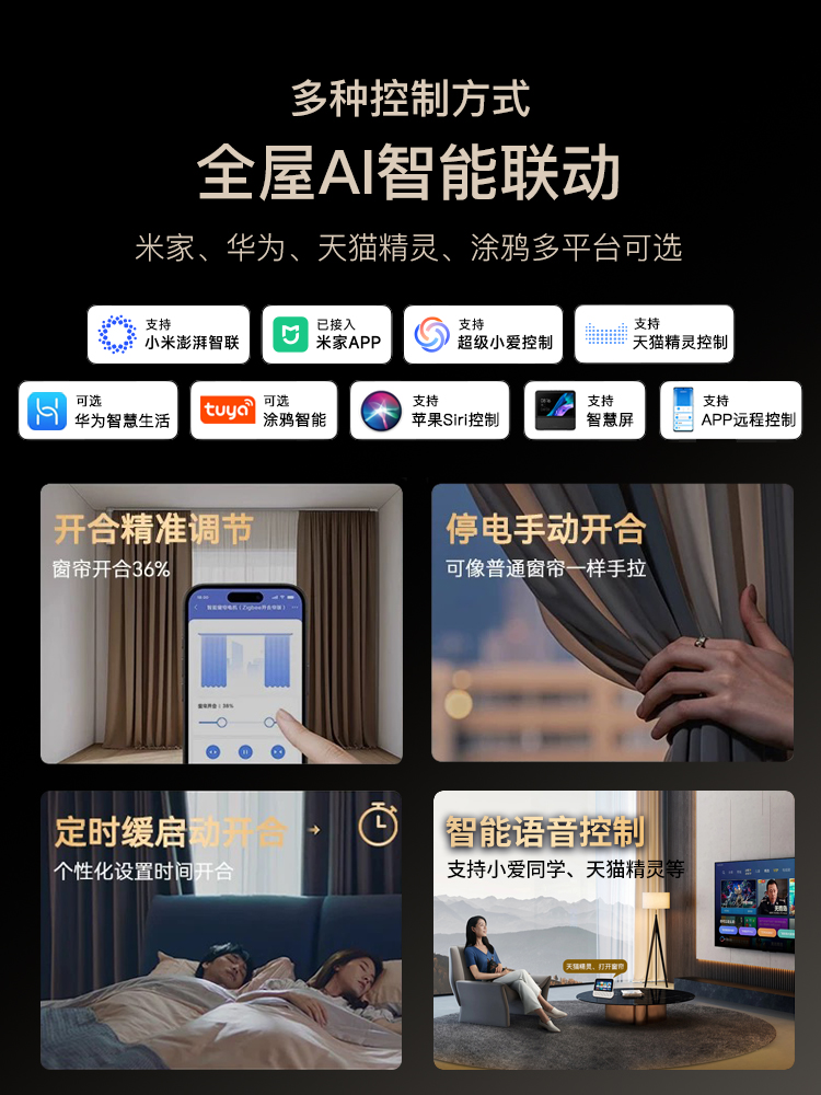 这一技术突破让用户即使在深夜开合窗帘也不会干扰睡眠,解决了传统电动窗帘的核心痛点。