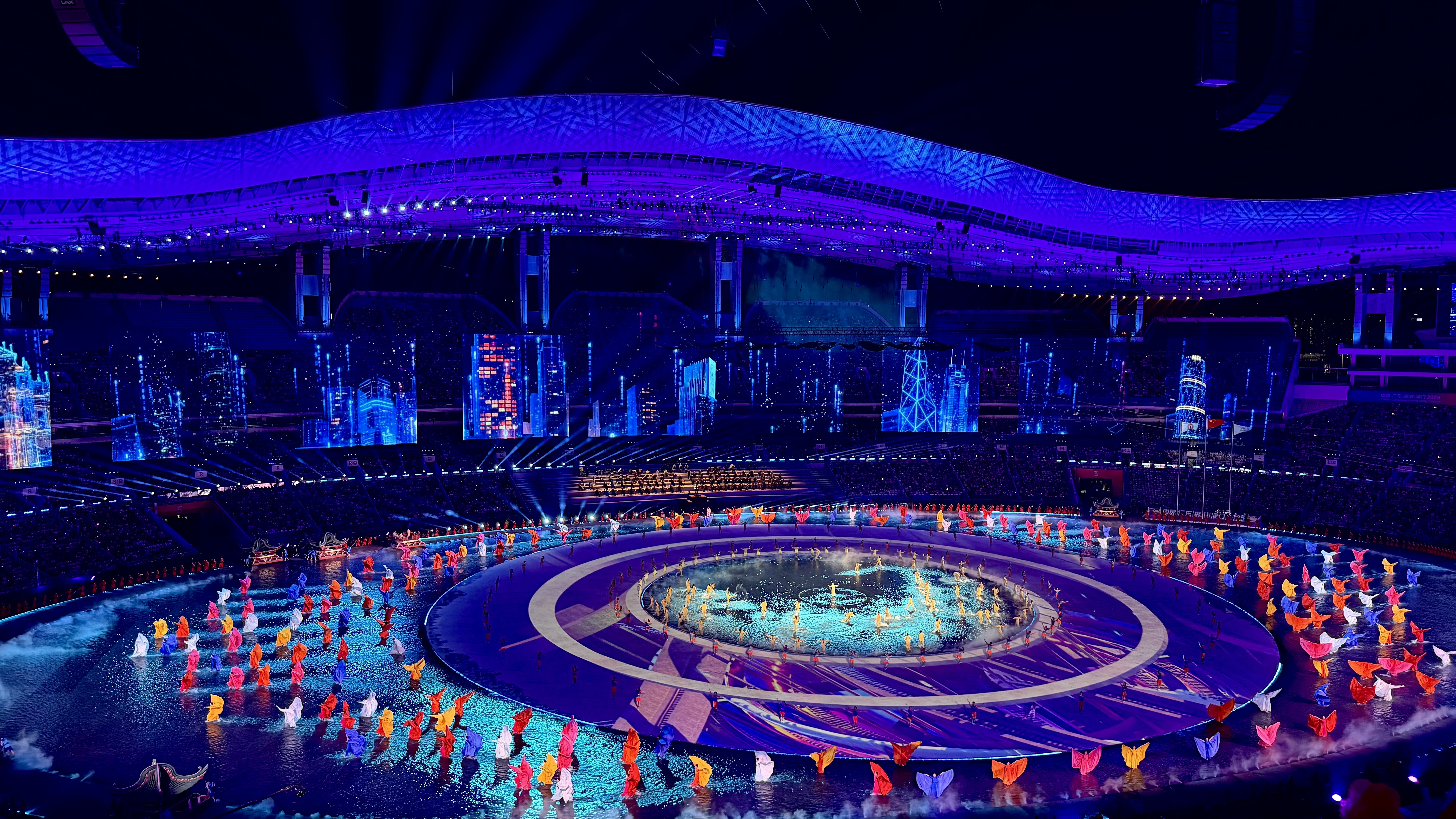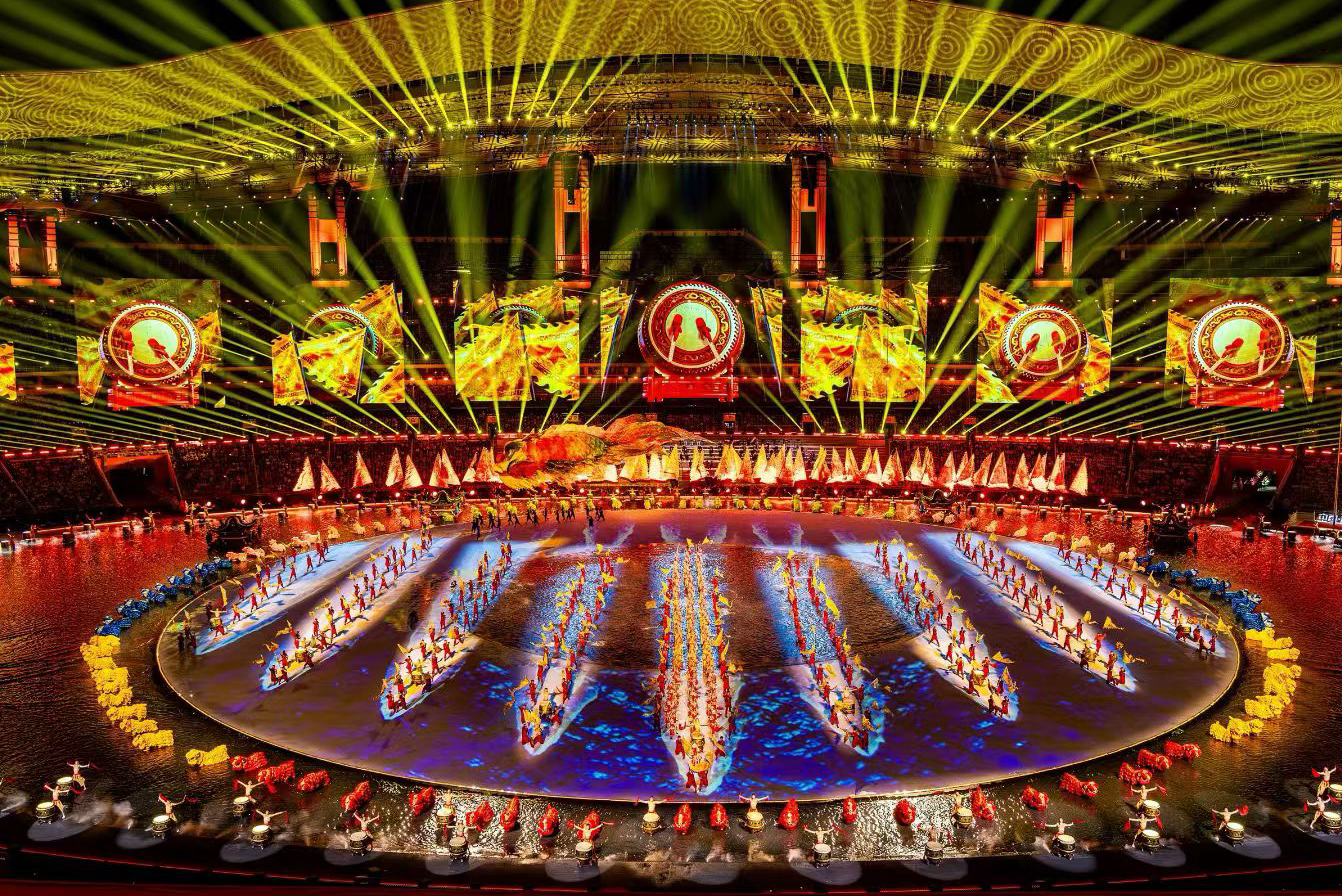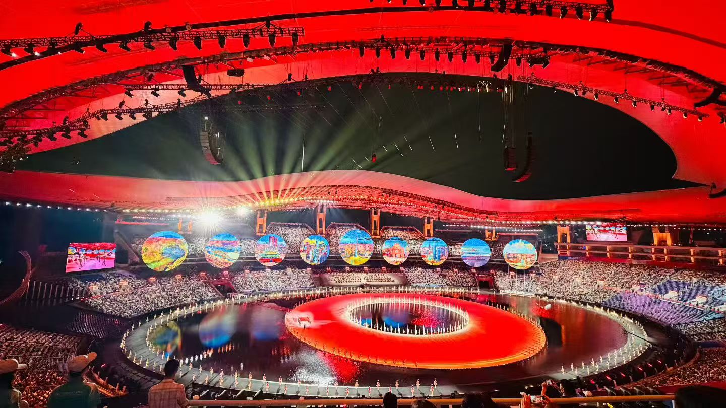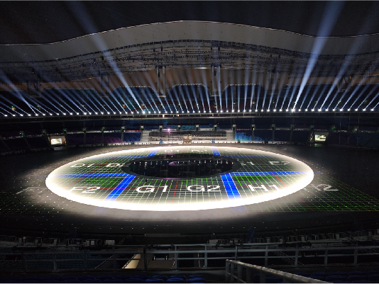 第十五届全国运动会开幕式的舞美设计以“同心圆”、“水文化”为理念,以环形舞台为核心铺设了20000平方米的水舞台,并以水面倒影创造空间镜像,营造出了悬浮舞台的独特视觉,实现了“在体育场里造大海”的磅礴效果。因此,这种高难度的艺术构想要求地面影像显示方案需拥有极高的灵活性和艺术表现力。