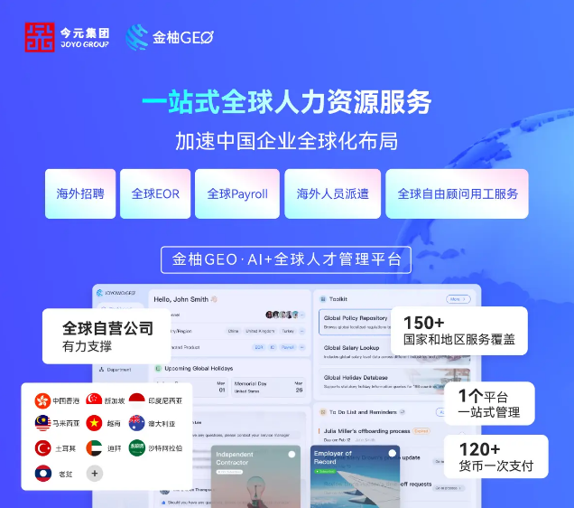 今元集团旗下海外业务子品牌「金柚GEO」提供海外招聘、全球EOR、全球Payroll、海外员工派遣、全球自由顾问用工等一站式全球人力资源服务,覆盖150多个国家和地区,分布于亚太、美洲、欧洲、中东、非洲等区域,并在中国大陆、中国香港、新加坡、印度尼西亚、马来西亚、越南、澳大利亚、土耳其、迪拜、沙特、老挝等多地设立公司,不仅实现了地理空间上的全面覆盖,更实现了服务能力的全球辐射。依托本地化运营团队与深厚的区域市场经验,集团为企业出海提供“零距离”的本地化支持,让企业在全球资源配置中无后顾之忧,为国际化扩张注入稳定动力。