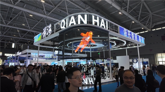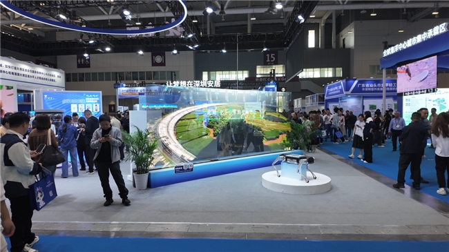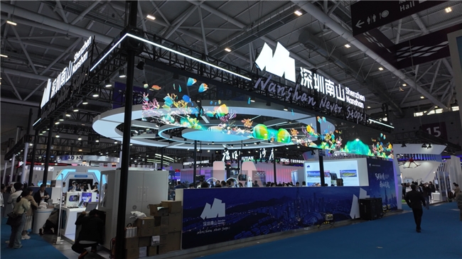 而在南山和前海展台,大面积的弧形吊装屏悬挂在展馆正上方,屏幕关闭时通透如无物,最大限度地保留了空间的通透性。一旦点亮,高清影像犹如悬浮在空中的AR幻影,鱼群、科技场景等动态内容清晰细腻。