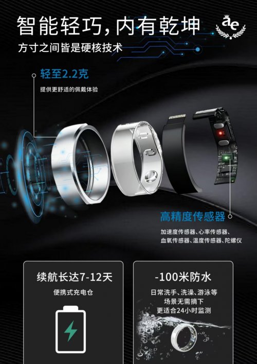 未来扁鹊智能戒指AI Ring不是又一款简单的运动追踪器,而是集心理健康监测(焦虑、抑郁、疲劳)、生理指标追踪(血管硬化度、血液粘稠度、心率、体温、血氧)、荷尔蒙(生理周期预测)于一体的全方位健康管家。这款设计优雅的智能指环能够24小时不间断监测您的身心健康状态,通过AI算法提前预警潜在风险,让您真正做到"防患于未然"。拥有多颗高精度智能传感器和芯片,可监测血氧,抑郁,荷尔蒙,情绪,睡眠,压力,疲劳,焦虑,心率,体温,预测血液粘稠度,血管硬化程度,心肌缺血,房颤心衰等风险。