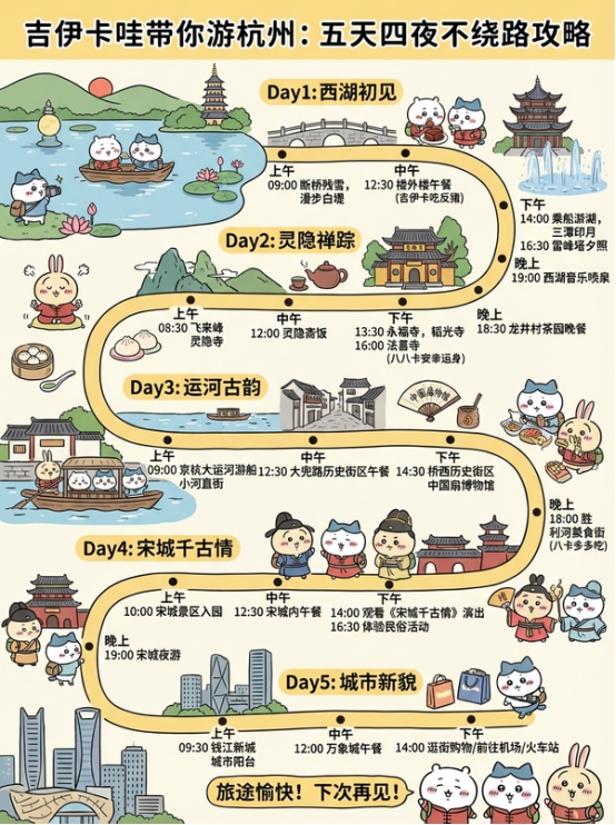 指令:使用【吉伊卡哇】的角色和相关主题元素,生成一张图文并茂、带行程路线和时间安排的【杭州】的五天四夜旅游不绕路攻略图,攻略文字用简体中文。