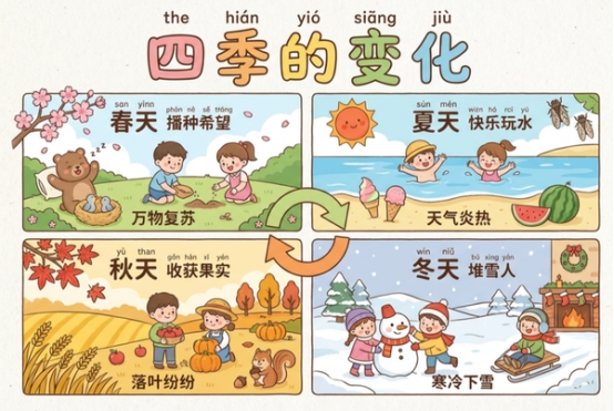 指令:做一张春夏秋冬季节变化的的科普海报,对象小学生。可爱易懂