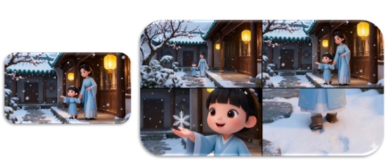指令:为该场景创建一个故事板,延续图片的画风,展示电影场景的远景镜头、中景镜头、特写镜头和主观镜头。