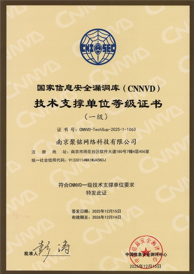 近日,聚铭网络凭借在漏洞挖掘、分析研判、原创漏洞报送、应急响应及预警支撑等领域的持续贡献,顺利荣升为国家信息安全漏洞库(CNNVD)一级技术支撑单位,成为该体系中最高等级的技术支撑力量之一。这是聚铭网络自2023年首次入选CNNVD技术支撑单位以来,连续三年实现资质跃升,再次获得国家级权威认可。