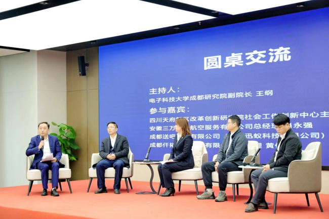 “低空经济作为战略性新兴产业,正通过无人机物流、城市空中交通等场景加速落地,未来需进一步突破空域管理、能源效率等关键技术,推动产业规模化发展。”研讨会以圆桌论坛拉开序幕,迅蚁子公司总经理、电子科技大学成都研究院院长王纲、安徽航空公司代表及四川天府新区改革创新研究院主任杨宗意等嘉宾,围绕低空经济的技术创新、市场应用及政策支持等议题展开深度对话。