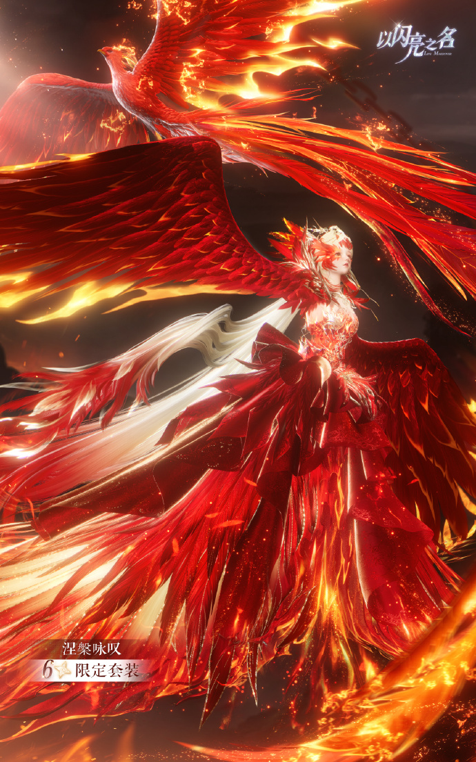 相较于其他以技术著称的游戏,《以闪亮之名》的技术并非为炫技而生,更重要的是针对基础能力的升级循环。自3.0技术阶段以来,以闪的迭代速度几乎像开挂。刚过去的版本里,那套被玩家称为“百万特效不死鸟”的涅槃咏叹六星套装,就是技术力重新提标的最新案例——羽毛、毛发、光效的动态表现几乎可以和 3A 大作比肩。无论是凤凰挥翅翱翔的动态动作还是时装周围的流焰都能呈现出近乎完美的动态美感,你很难想象一款女性向游戏能把物理表现做到这种程度,让每一次转身都能带出真实重量、细节纹理和光影折射。