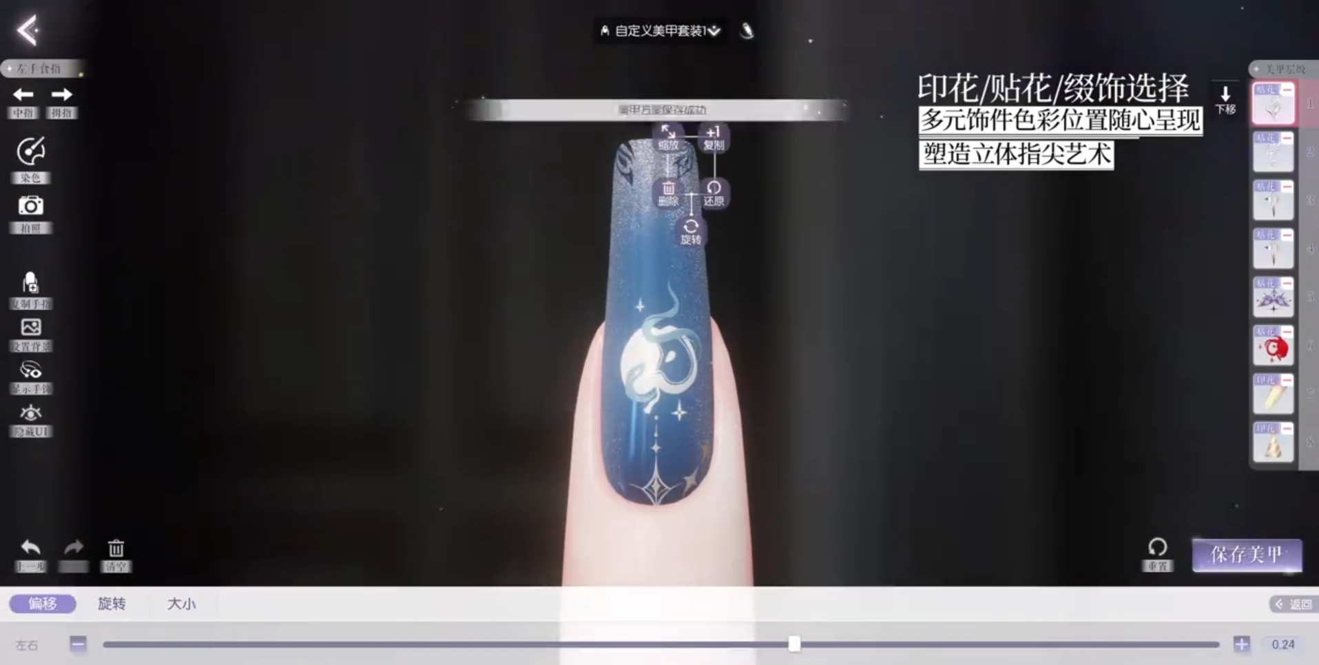 不仅如此,以闪的技术并不只服务于“角色更好看”,而是服务于“真正的创作自由”。正如即将上线的美甲系统,甲型不仅有日常款式,还覆盖到极具设计感的异型指甲,装饰位置也能进行高度精细化编辑。这类系统本质上门槛很高,但以闪把技术反哺成自由度,让更多的玩家们能够以自己的喜好来搭配心仪的美甲,以技术力成就玩家们向往美的梦想。