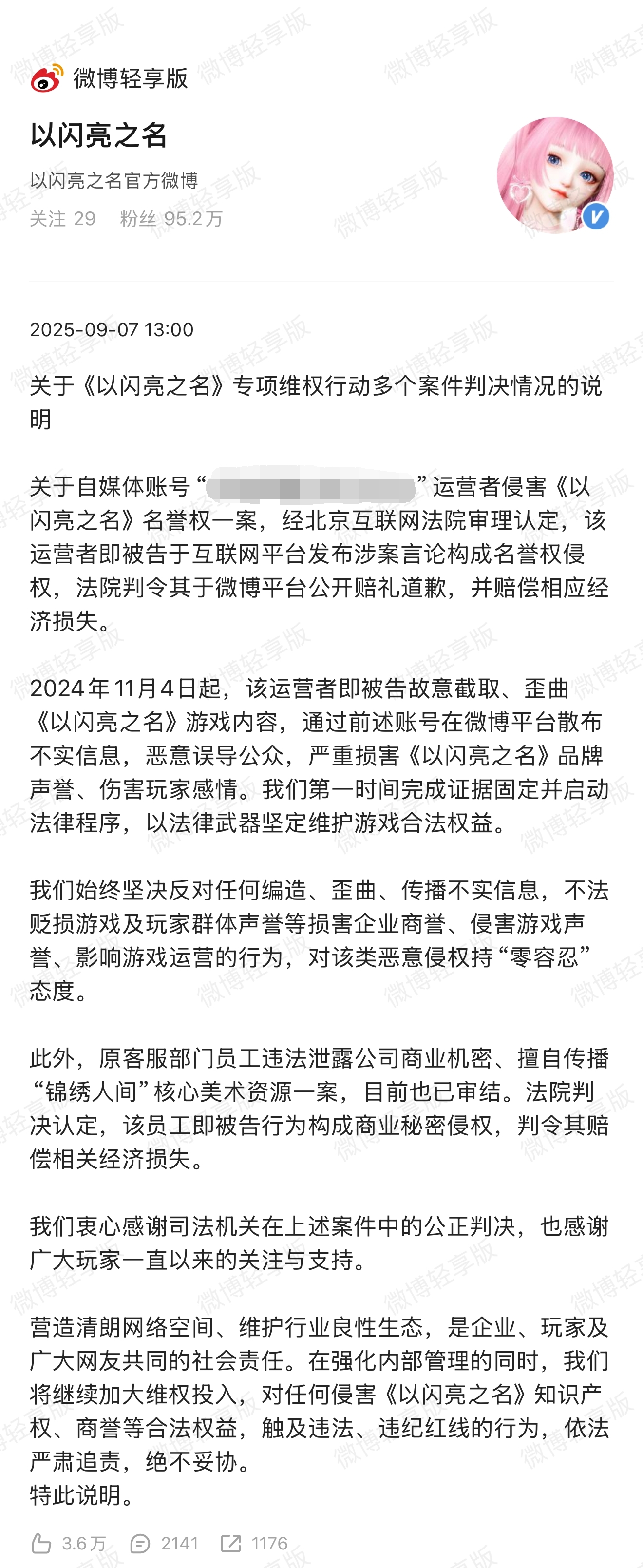 然而技术只是《以闪亮之名》的一个维度,真正让这款游戏始终能维持强势口碑的,是它和玩家建立的罕见“信任契约”。前阵子大家所熟知的蜀绣非遗联动外泄事件便是如此,官方发布维权行动说明,用最笨的方式,做了最难坚持的事:用大半年的时间走完法律流程,并把胜诉结果原原本本告诉玩家。内部泄露蜀绣非遗设计稿本可以轻描淡写带过,但官方坦诚承担责任、公开致歉,同时对恶意造谣的行为零容忍,这不仅是对支持和信任以闪玩家的重视,也是对传统非遗文化的尊重与肯定。