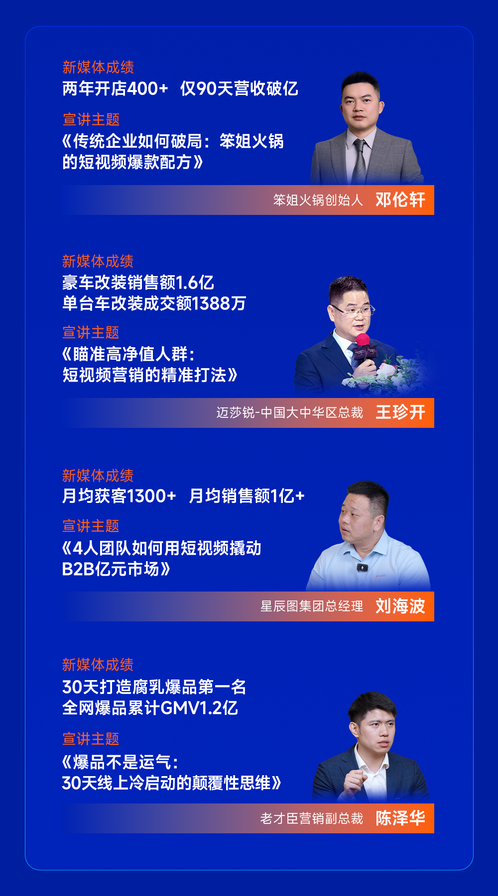 笨姐火锅创始人邓伦轩拆解两年开店 400+、90 天营收破亿的短视频爆款配方;迈莎锐中国大中华区总裁王珍开聚焦高净值客群,分享豪车改装线上销售额1.6亿+、单台成交1388万的短视频营销打法;星辰图集团总经理刘海波揭秘4人团队撬动 B2B 亿元市场的核心逻辑,实现月均获客1300+、月销1亿+;老才臣营销副总裁陈泽华则分享30天线上冷启动打造腐乳爆品、GMV突破1.2亿的战略思维。