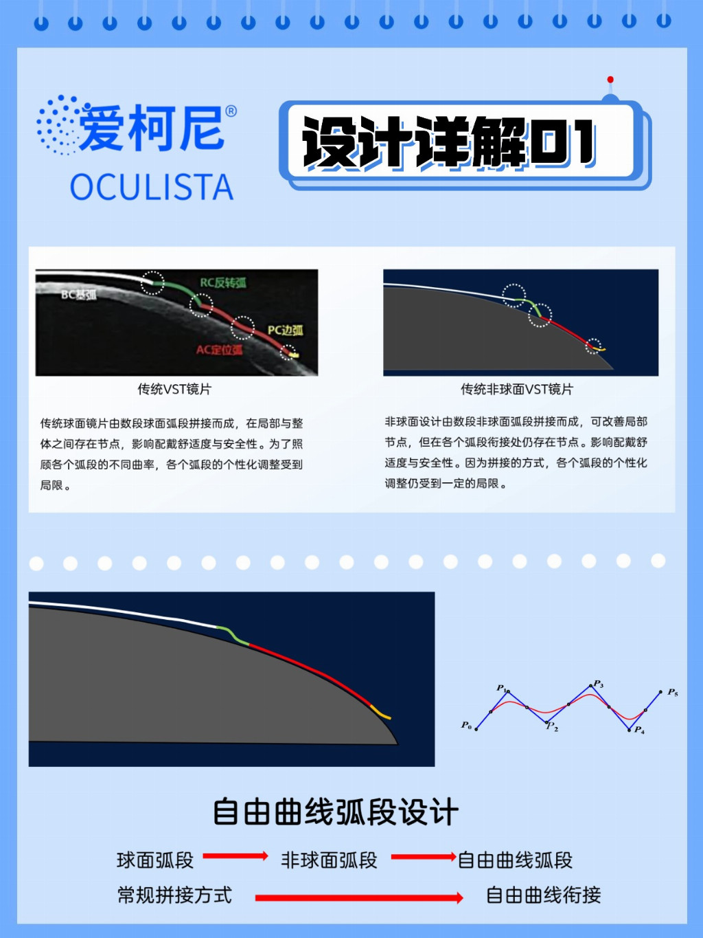传统OK镜片各弧段间存在明显过渡节点,容易导致佩戴不适和泪液流动受阻。爱柯尼通过自由曲线设计,使镜片弧段通过样条曲线自然连接,大幅提升了镜片的一体性和贴合度。