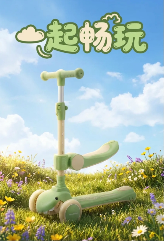 提示词:生成一张电商海报图,车子放在草地上面,背景是天空,草地上面有花草等等,海报字体是:“一起畅玩”,字体要有设计感 2、Q版贴纸头像