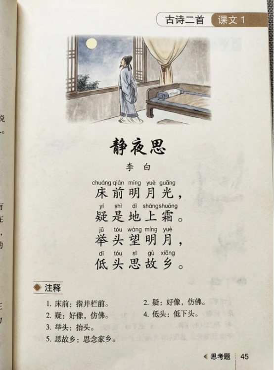 提示词:参考中国语文课本,为古诗《静夜思》生成一页课文,诗、拼音、注释一应俱全。