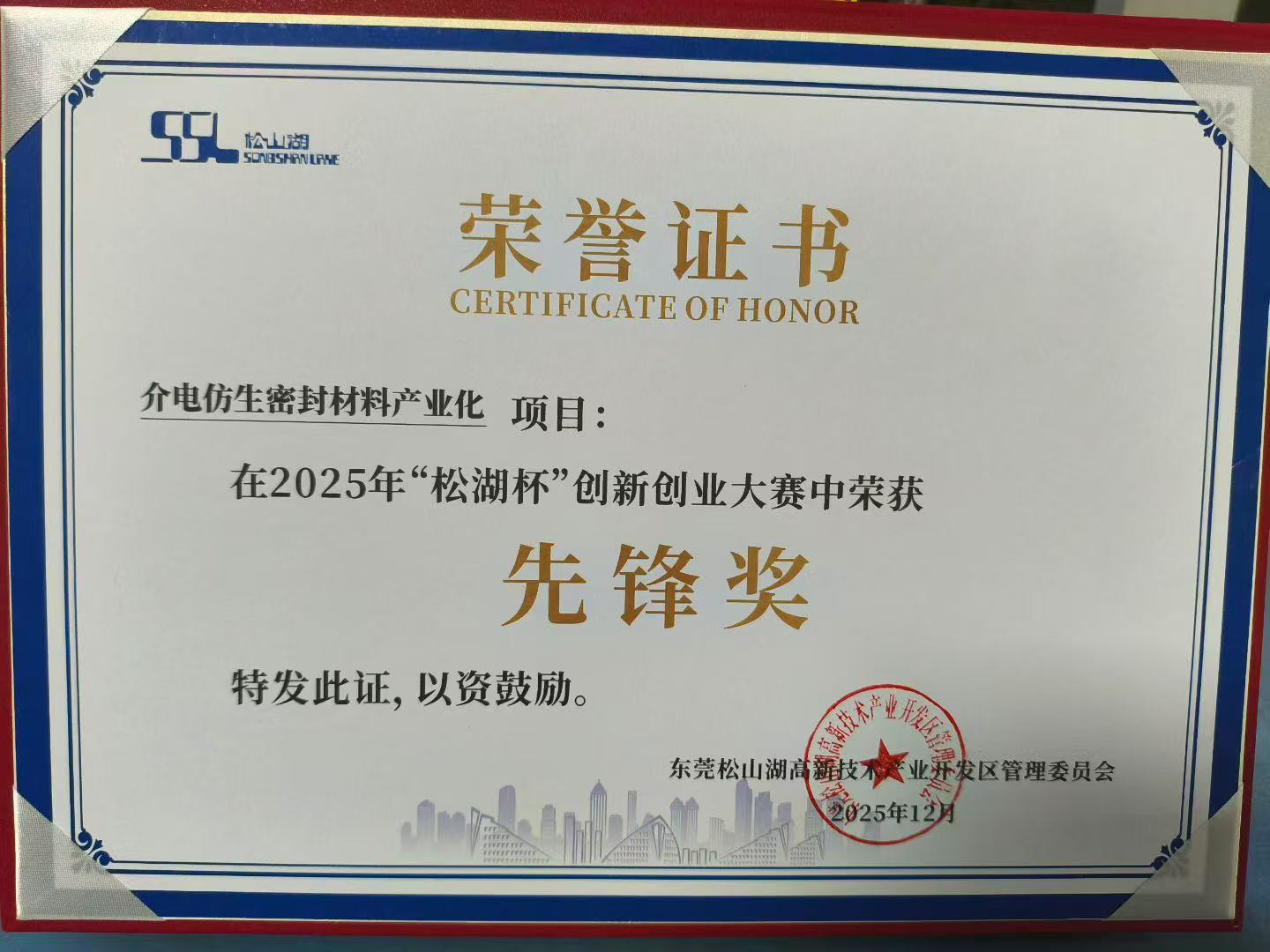 经过层层选拔,国内密封件行业领军企业——广东东晟密封科技有限公司,凭借在高端密封材料领域的突破性创新项目《介电仿生密封材料产业化》,在全国超600个项目中突围而出,获得赛事“先锋奖”。此次获奖,是“松湖杯”创新创业大赛对东晟密封研发实力、技术创新水平及行业影响力的高度肯定。