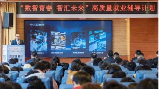 在主题分享环节,苏州陆汇信息科技集团集成电路人才培养负责人王迎帅围绕“高质量就业”主题,深度剖析了工业4.0背景下的就业形势与技术成长路径。针对学生普遍存在的技术焦虑,王迎帅表示,虽然智能机器能替代重复性劳动,但永远无法替代人的创造力与匠心温度。他形象地比喻道:“如果将学历教育视作发动机的‘基础排量’,那么精准的职业技能培训就是‘涡轮增压’系统。”随后,他详细介绍了工业机器人、集成电路、低空经济等重点领域的发展机遇,并指出这些国家战略新兴产业正面临巨大的人才缺口,是毕业生实现高质量就业的“黄金赛道”,以此鼓励学生们通过锚定前沿、躬身实践来寻找、确定自己的职业规划。