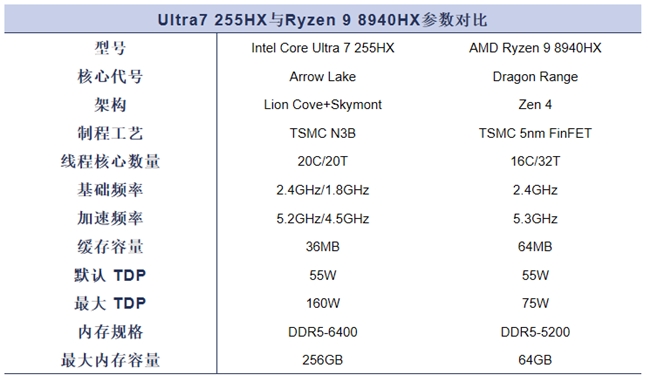 一、核心对决:酷睿Ultra 7 255HX vs锐龙9-8940HX