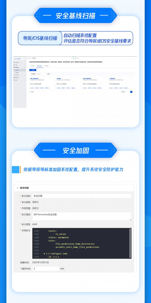 包含等保/CIS基线扫描能力,自动扫描系统配置,评估是否符合等保或CIS安全基线要求。