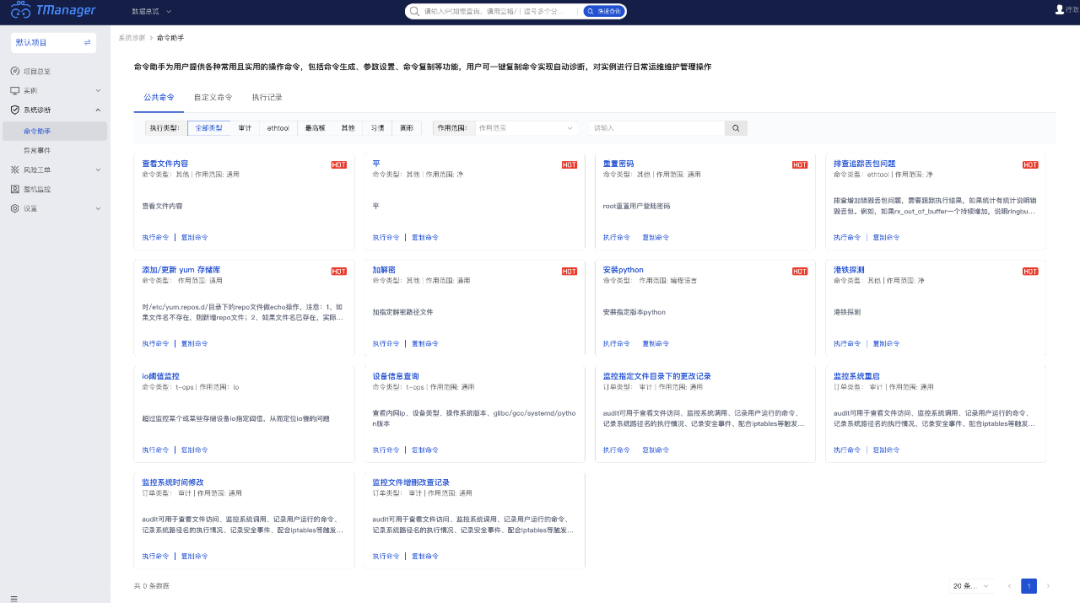 TManager智能运维管理平台首期涵盖漏洞发现、漏洞一键修复、实例与集群管理、OS整机监控、系统诊断、补丁管理等在内的30余项安全运维管理功能,能通过AI智能诊断快速识别并定位系统问题和故障,提供多项常用命令助手工具,提高运维效率,助力优化服务器系统性能。