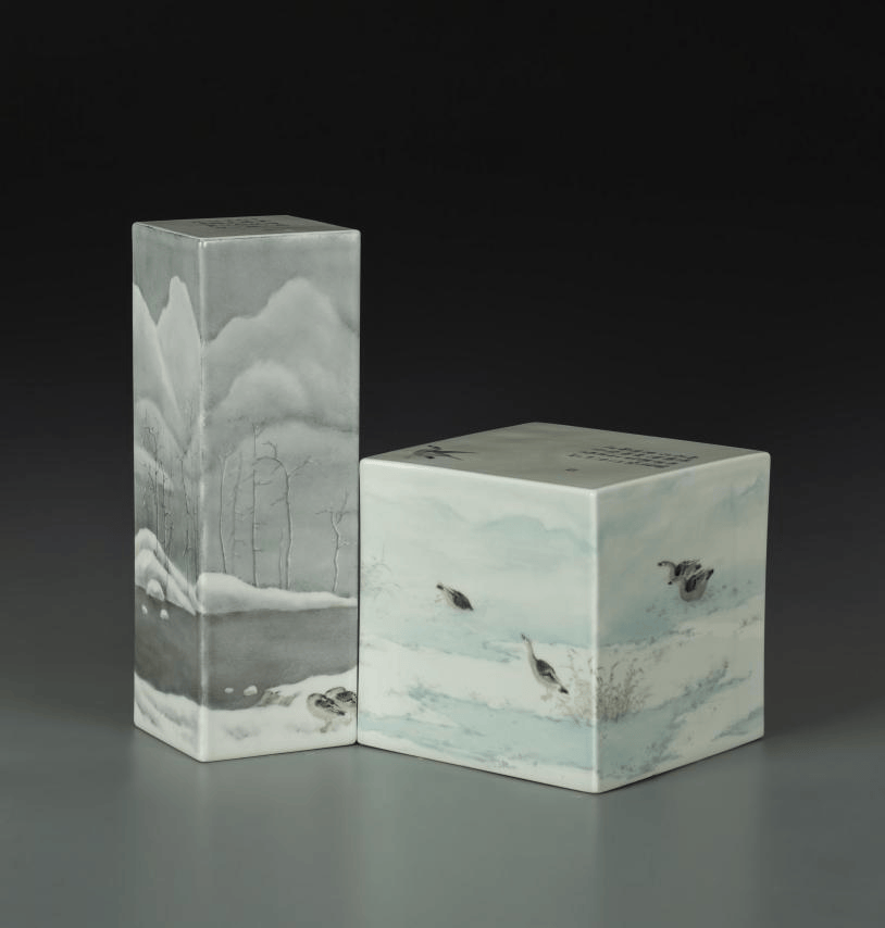 材质:新浅绛彩镶器 作品名称:《芦雁图·雪意》尺寸:左12×12×35cm 右20×20×20cm