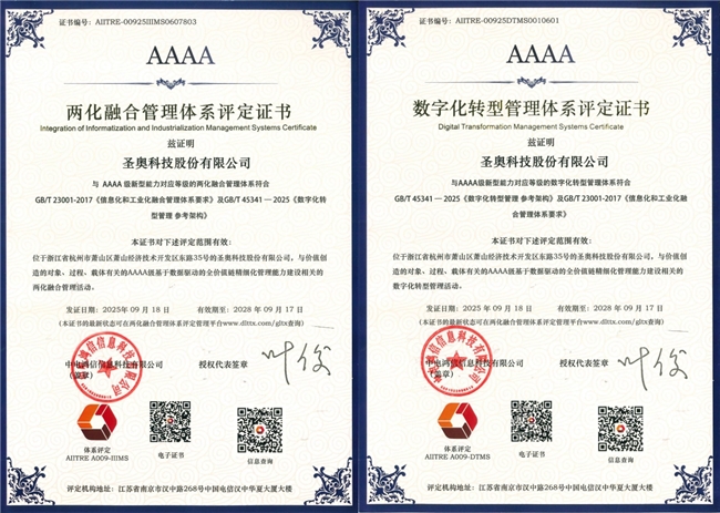圣奥自2018年起实施“1+N”数字化战略,以数据中台为核心构建全链路业务平台。2023年升级“双中台”战略,使得业务调整更加灵活迅速。“一键报价”“一键下单”“一键生产”“一键报修”等数字平台,推动业务流程全面智能化。凭借在数字化领域的深度实践,圣奥成为全国首批、浙江省唯一获得企业两化融合管理体系3.0与数字化转型管理体系4A等级认证的企业,为行业数字化转型提供了可复制的“圣奥方案”。
