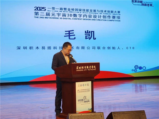 积木易搭毛凯:紧扣产业的热门应用,大赛为产业用人需求与院校人才培养搭桥深圳积木易搭科技技术有限公司联合创始人&CTO毛凯作为大赛联合承办方、技术支持方代表发言。他强调,当前,在元宇宙生态中,3D数字内容的生产与开发已成为推动数字经济增长的重要引擎。从数字孪生工厂到文旅沉浸式体验,从虚拟仿真实训教学到虚拟空间直播,3D数字内容的开发与应用正加速融入千行百业,催生出全新的产业形态与巨大的商业价值。