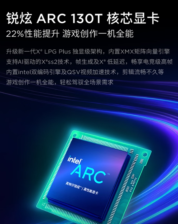 其集成的锐炫Arc 130T核显更是性能亮点,拥有112个Xe核心,支持XeSS2帧生成、AV1硬解编码等现代视频处理技术,图形处理能力媲美入门级独立显卡。在实际剪辑中,无论是4K视频流畅播放,还是PR、DaVinci Resolve等专业软件中的调色渲染,都能轻松应对,无需担心核显性能不足导致的操作卡顿。
