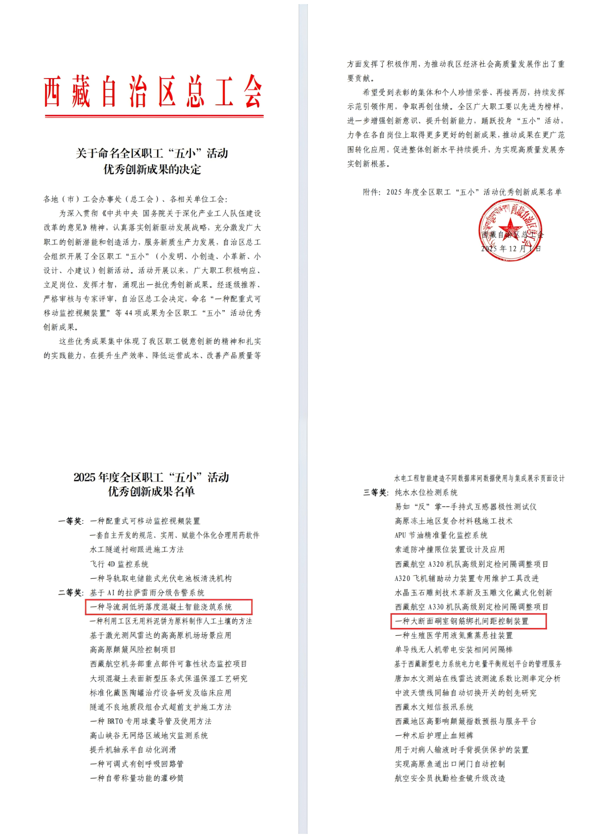2025年两项成果再次获评西藏自治区工会优秀创新奖,彰显项目“解决真问题、创造实价值”的硬核实力。针对低坍落度(≤90毫米)混凝土施工这一世界性难题,项目独创的“智能浇筑系统”将单仓134立方米混凝土浇筑时长从18小时大幅压缩至11小时。该系统在累计610个仓段、8.2万立方米浇筑中,实现密实度合格率100%,蜂窝麻面缺陷率降至0.3%,荣膺二等奖。“大断面硐室钢筋绑扎控距装置”通过自主研发的定位卡具与刻度标尺,将纵向钢筋间距误差严格控制在2毫米内,于7.6公里洞身应用中绑扎点合格率达99.8%,斩获三等奖。
