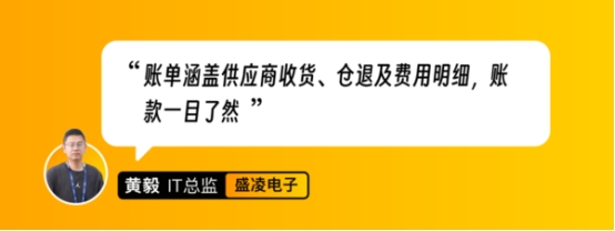 【案例】在连接器行业深耕近30年的盛凌电子,通过SRM系统在线对账,供应商在线即可发起对账请求,系统中账单涵盖供应商收货、仓退及费用明细,账款一目了然,采购一键确认,供应商就可以开票了。