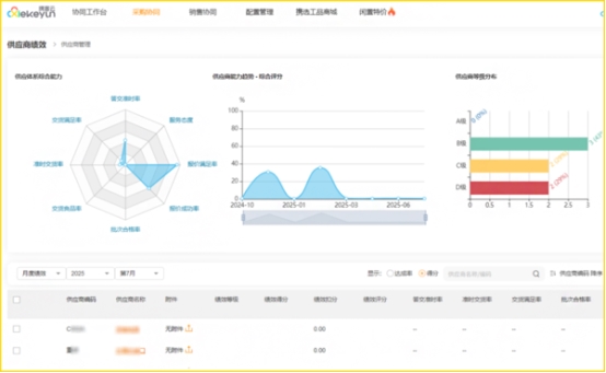 过去,企业只对正式供应商进行管理,未对潜在供应商留痕,导致供应商开发部门做的前期评估工作都浪费了。携客云实现对供应商从登记申请、选择、评估到正式合作的全流程线上化管理。甚至在供应商清退环节,其历史订单、送货、对账、费用、绩效等情况也清晰可查,确保退出流程合规透明。