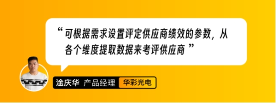【案例】全球高品质照明品牌——华彩光电,通过携客云实现从潜在供应商的开发、评估、引入,到供应商正式交易、绩效评估和风险管控,再到供应商推出的全生命周期的管理。并根据自身需求设置评定供应商绩效的参数,从各个维度提取数据来考评供应商,直观展示供应商绩效情况。