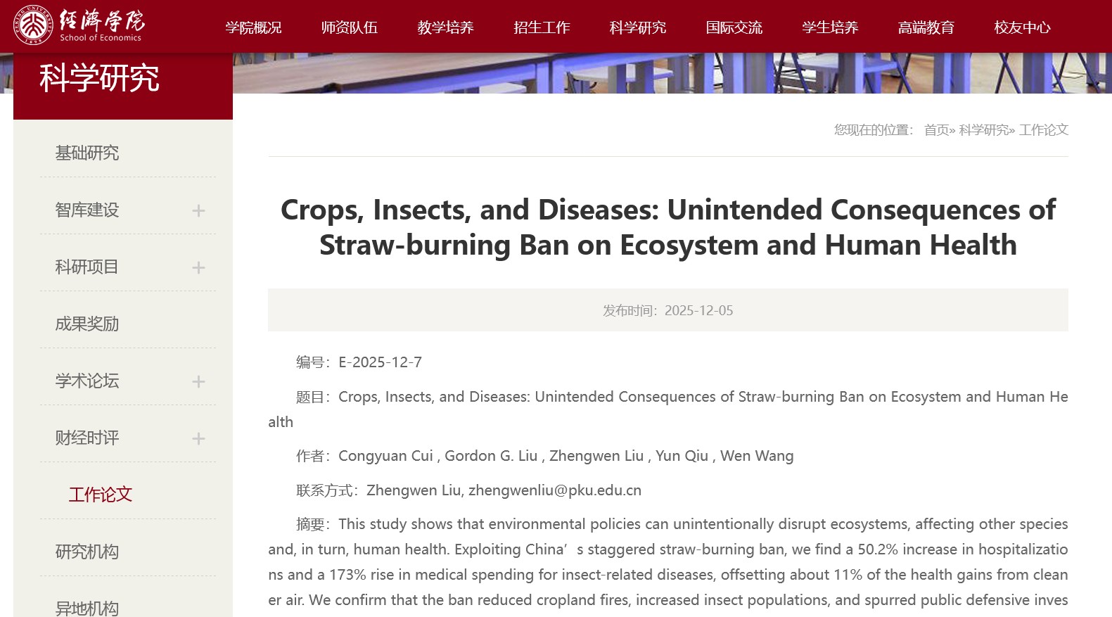 近期,来自北京大学经济学院、北京大学全球健康与发展研究所、暨南大学经济与社会研究所的4位作者和香港科技大学通讯作者,在北大经济学院官网发布了一篇工作论文《Crops, Insects, and Diseases: Unintended Consequences of Straw-burning Ban on Ecosystem and Human Health》,通过研究农作物、昆虫和疾病发生的因果关系,探讨了秸秆燃烧禁令对生态系统和人类健康的意外后果。