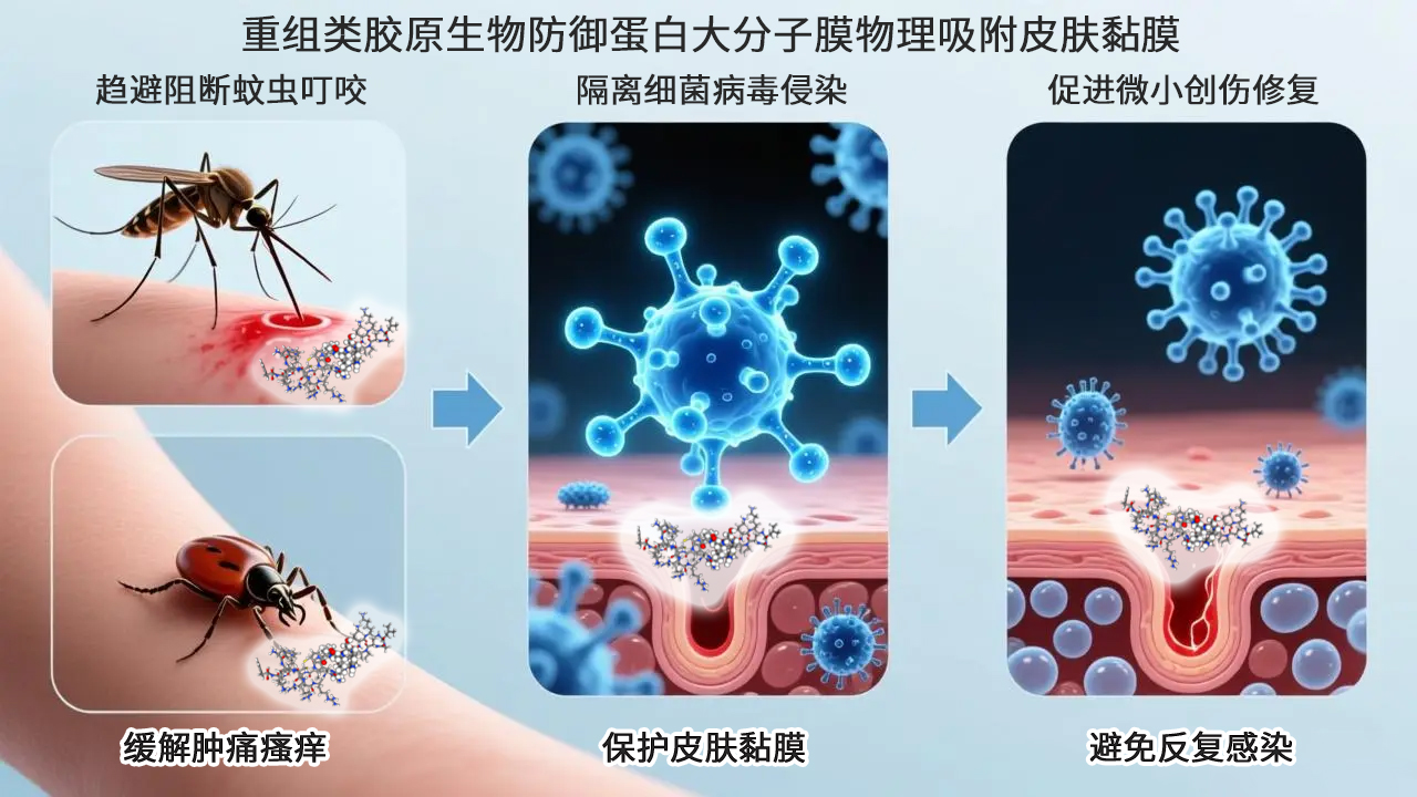 面对这项研究揭示的严峻公共卫生挑战,亟需应对虫媒疾病对人类健康威胁的新方案。在此背景下,福莱明生物研发的重组类胶原生物防御蛋白(PHPV融合因子系列产品)提供了一种创新的生物防御思路。该技术聚焦于应对虫媒叮咬人体的防护与修复。其核心作用是: