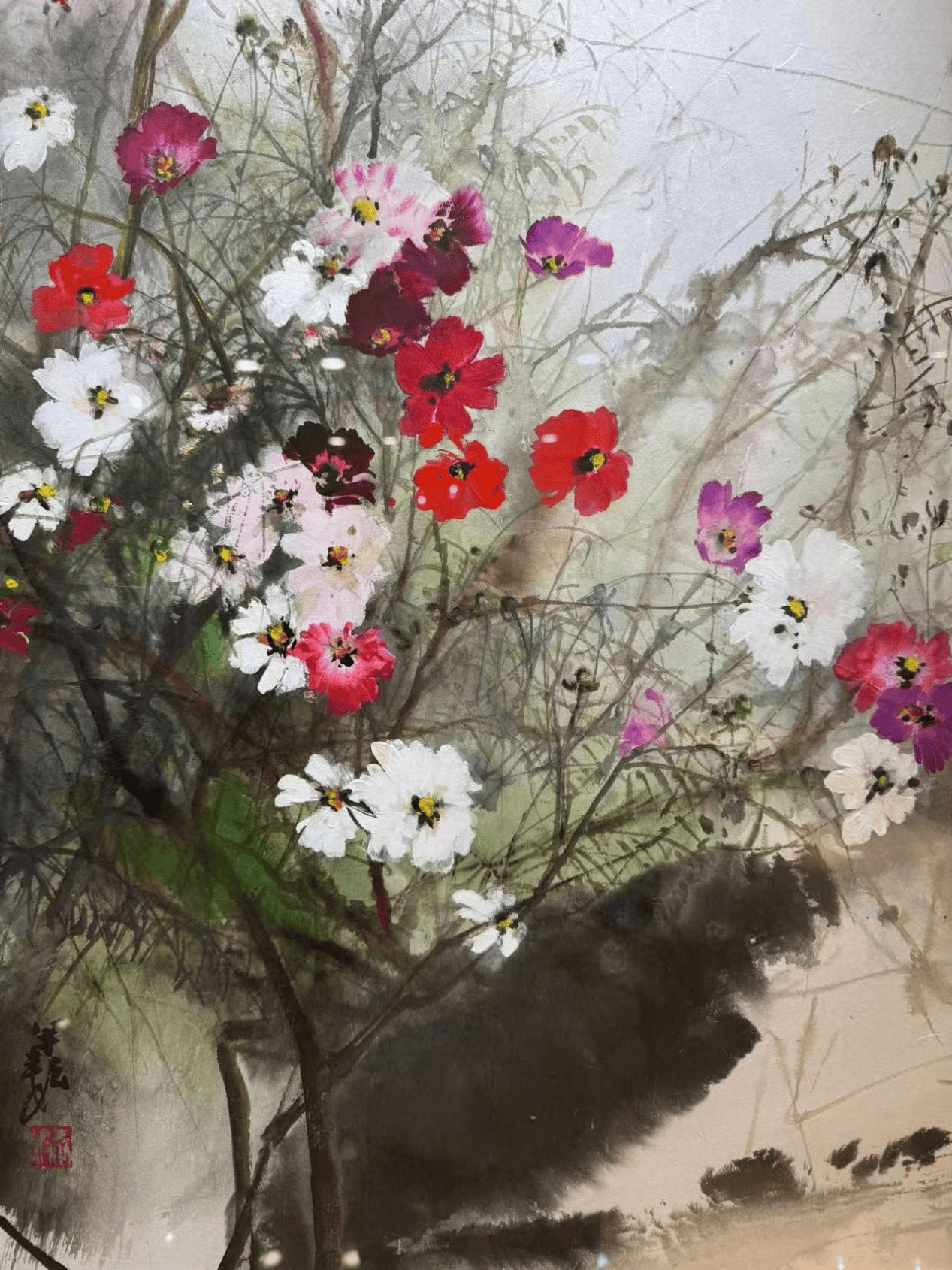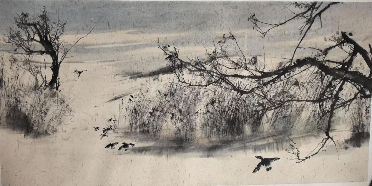 本次展出的百余幅作品,是袁波艺术创作的集中呈现,涵盖传统写意、现代创新等多个系列,题材以花鸟为主,包括荷花、芦雁、禽鸟等经典中国画意象。展览现场,《碧塘红莲》《芦雁曲》等代表性作品引发关注。《碧塘红莲》以墨叶为底、白莲为景,留白处尽显空间通透感;《芦雁曲》则以枯苇搭配雁影,通过笔墨传递乡愁情怀。此外,部分抽象写意作品以流动线条与交织色彩表达情感,让观者在笔墨中感受艺术家对生活的热爱与对自然的敬畏。