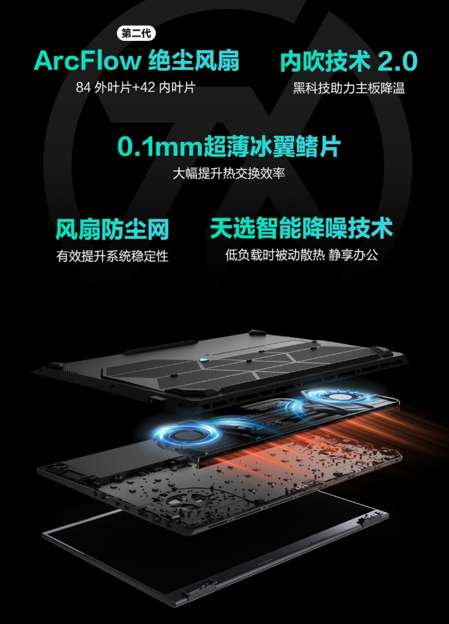 另一方面,这款游戏本搭载了升级后的冰川散热系统,配备两个第二代ArcFlow绝尘风扇、0.1mm超薄冰翼鳍片,以及内吹技术2.0。不同于传统散热方案,内吹设计将风道由向外“吹热风”改为向内“灌凉风”,能将冷空气直接输送至CPU、GPU等核心发热区域,散热效率显著提升。实际测试表明,即便连续进行几把《英雄联盟》排位赛,键盘区温度也能控制在40℃以下,不仅有效延长了硬件使用寿命,更让玩家在长时间对战中始终保持舒适操作状态。
