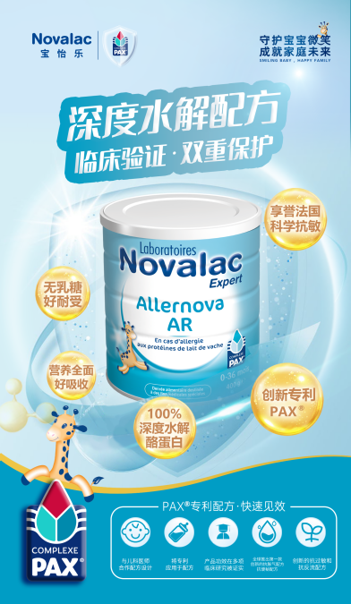 对于乳蛋白过敏的宝宝来说,回避过敏原仅是基础。他们往往同时面临消化不适的挑战。Novalac宝怡乐创新添加的专利PAX®益生元复合物,将 “低致敏性”与“肠道健康支持” 纳入双重考量,通过成分的协同作用,为敏宝提供更全面的营养支持方案。
