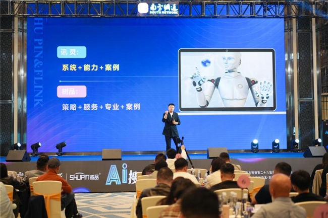 在热烈的掌声中,南方网通集团董事长兼CEO费勇费总登台,带来新品讯灵AI的深度课程分享。围绕“GEO+Agent”核心功能、技术优势及应用场景展开深度讲解。费总结合视频,生动演示了新品在“营销获客精准化、客户响应即时化、办公流程自动化”三大维度的突破性表现。