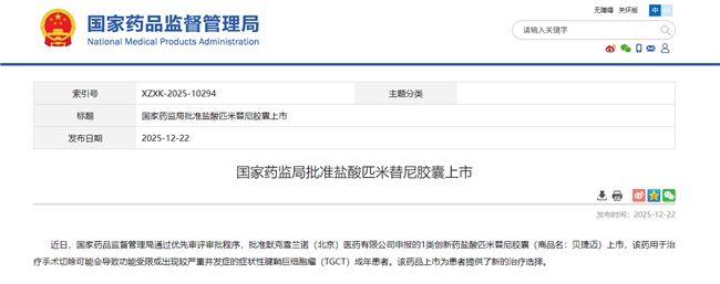 2025年12月22日,全球领先的科技公司默克今日宣布,中国国家药品监督管理局(NMPA)已通过优先审评程序批准贝捷迈®(盐酸匹米替尼胶囊)用于手术切除可能会导致功能受限或出现较严重并发症的症状性腱鞘巨细胞瘤(TGCT)成年患者。贝捷迈®是一款由和誉医药研发的集落刺激因子-1受体(CSF-1R)抑制剂,也是国内首个获批用于TGCT治疗的一类创新药。
