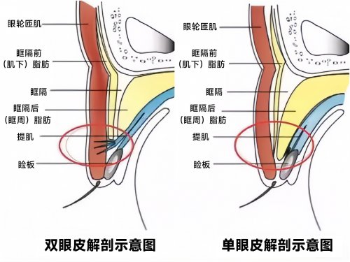 想要脱“单“”,首先要了解双眼皮形成机制,它从提肌腱膜生成的纤维一直向上伸展与眶隔产生融合,并附着在眼睑皮下形成了皱褶,就出现了双眼皮。