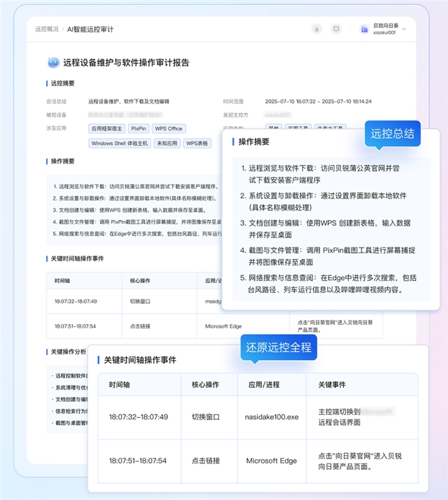 这意味着,安全管理员或IT主管无需再耗费数小时观看录像,即可在几分钟内掌握一次复杂远程支持的全貌,快速定位违规操作或故障源头,审计效率得到质的飞跃。