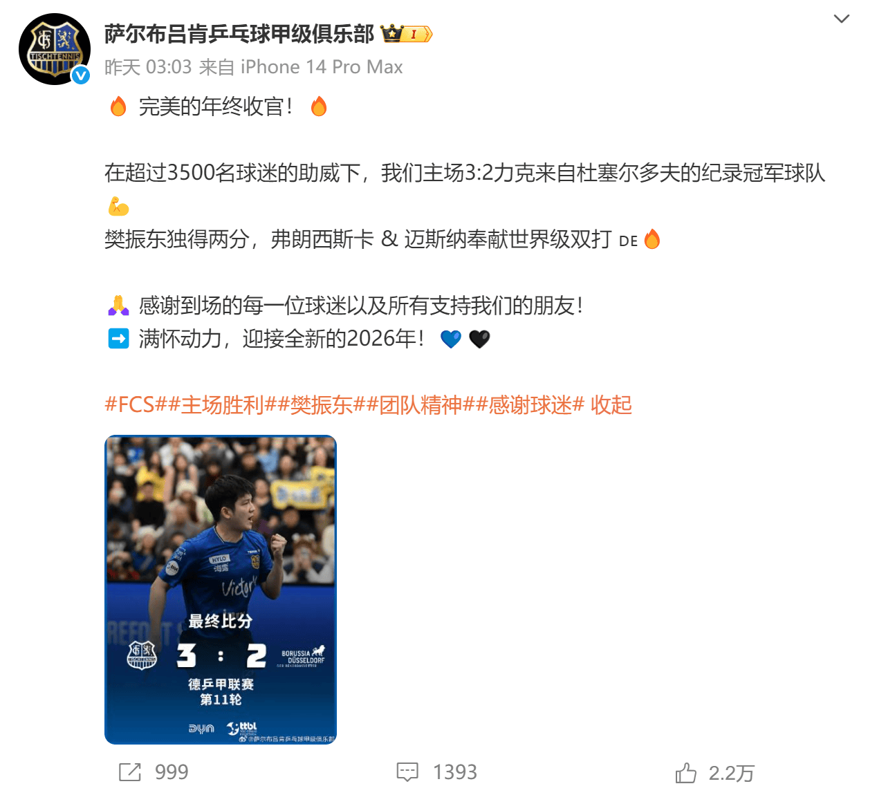 萨尔布吕肯乒乓球俱乐部取得德甲第11轮胜利,图源:萨尔布吕肯乒乓球俱乐部官方微博