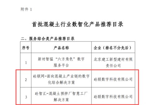 中国混凝土与水泥制品协会(以下简称协会)分批次评价和发布《混凝土行业数智化产品推荐目录》(以下简称《推荐目录》),首批共有19家企业37款产品、设备和解决方案入选,砼联科技2项产品收录其中。