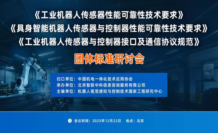 2025年12月22日,由中国机电一体化技术应用协会提出并归口,由湖南大学机器人视觉感知与控制技术国家工程研究中心主编,上海纬钛科技有限公司、东南大学、湖南移动、河南工业大学、天津理工大学 、北京极智嘉科技有限公司、南通理工学院、深圳鑫精诚传感技术有限公司、北京忆海原识科技有限公司、国讯芯微(苏州)科技有限公司、北京晶智感新材料有限公司、上海映矽传感技术有限公司、陕西科技大学、合肥工业大学等标准工作组成员及参编企业30多家单位参研的《工业机器人传感器性能可靠性技术要求》《具身智能机器人传感器与控制器性能可靠性技术要求》《工业机器人传感器与控制器接口及通信协议规范》3项标准工作研讨会采用线上会议的方式在北京召开。