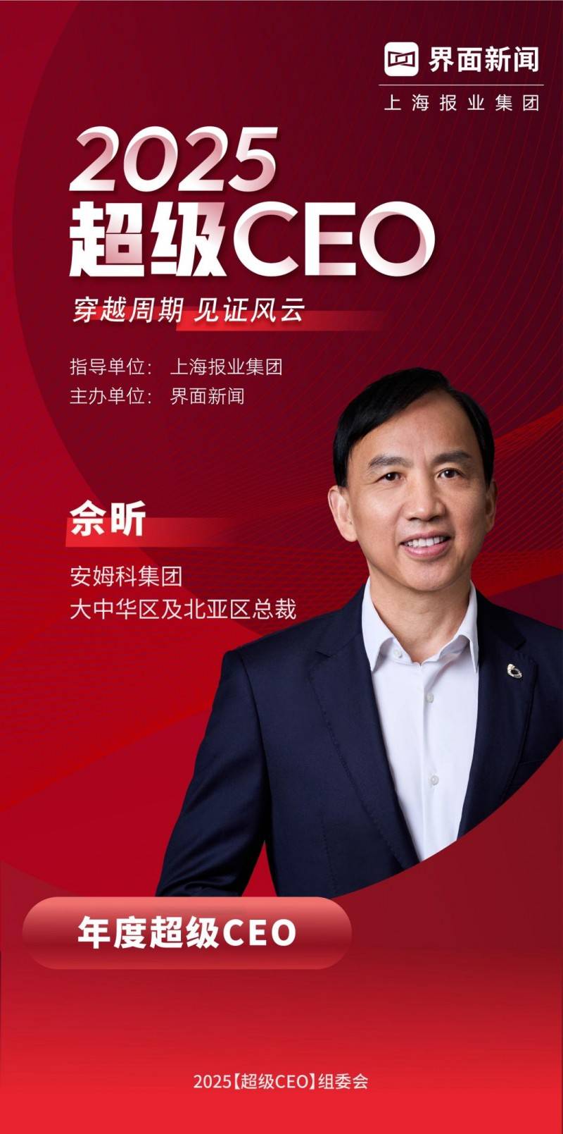 2025 年 12 月,安姆科集团大中华区及北亚区总裁佘昕凭借其在行业内的卓越领导力与企业经营的亮眼业绩,荣膺界面新闻2025「年度超级CEO」。