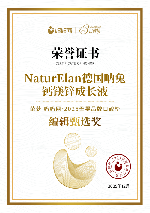 在万千家庭的关注下,2025妈妈网母婴品牌口碑榜于12月19日正式揭榜,为新生代父母呈上一份真实、权威、可信赖的《母婴品牌年度消费指南》。其中,NaturElan德国呐兔钙镁锌成长液凭借其在科学配方与高效促骨生长方面的卓越表现,荣膺“编辑甄选奖”。