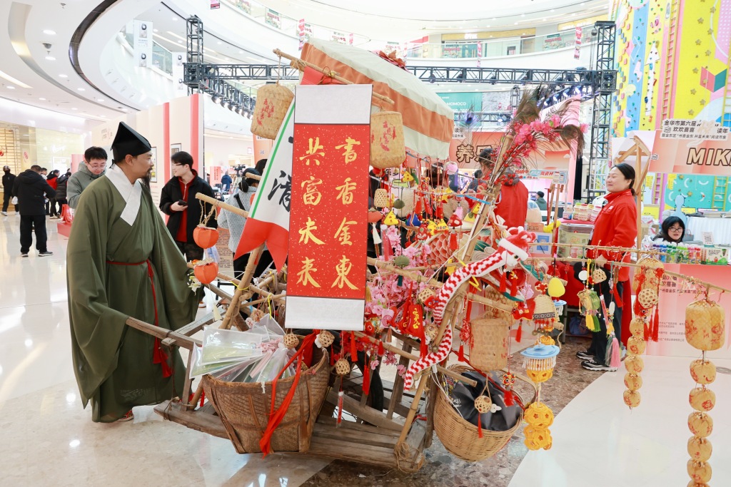 “锦绣汉裳·金婺问答礼”互动区中,身着传统服饰的工作人员推着问答车穿梭人群,抛出金华历史、金东文旅等相关问题,市民争相抢答,答对者手持小礼品喜笑颜开,在轻松互动中加深了对本土文化的了解。以书换“shu”区也早早排起长队,市民提着闲置图书前来,有的换取新鲜蔬菜,有的换取“知识便当”盲盒。